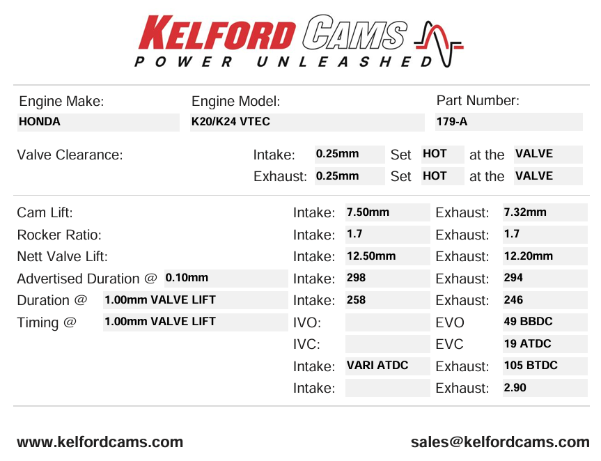 KELFORD CAMS HONDA K SERIES 179-A K20 K24