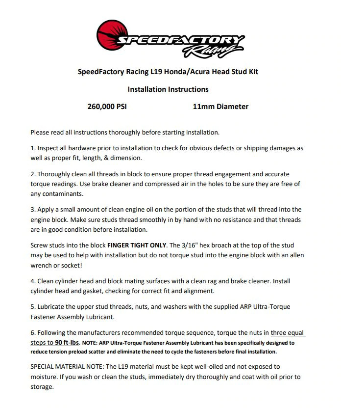 ·Each kit includes a complete set of L19 head studs, nuts, washers, ARP Assembly Lubricant, and detailed instructions with torque specifications.